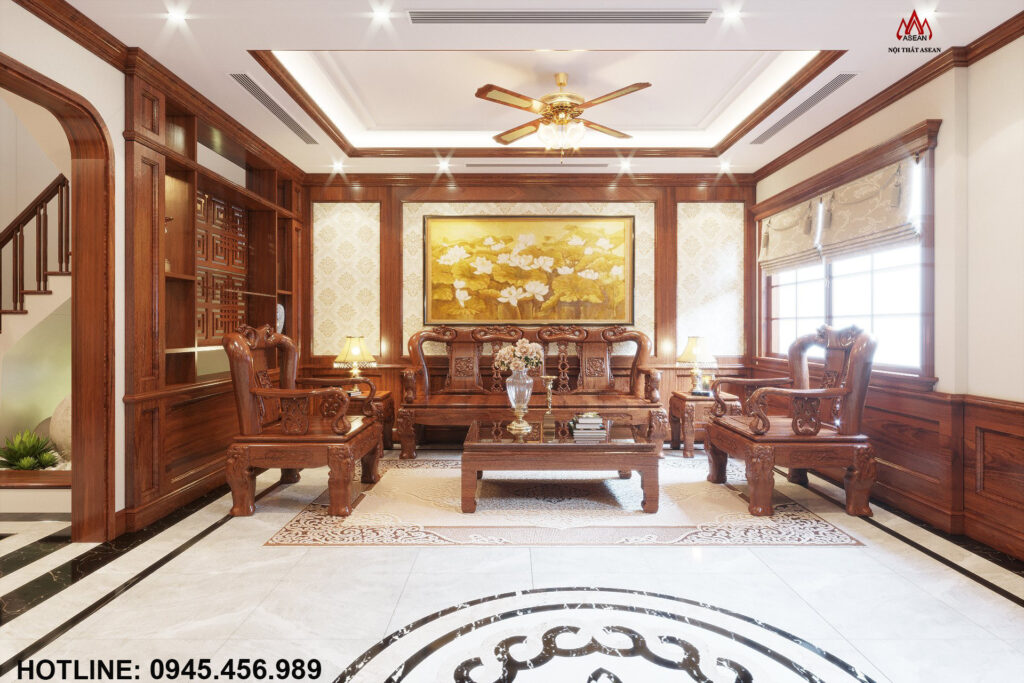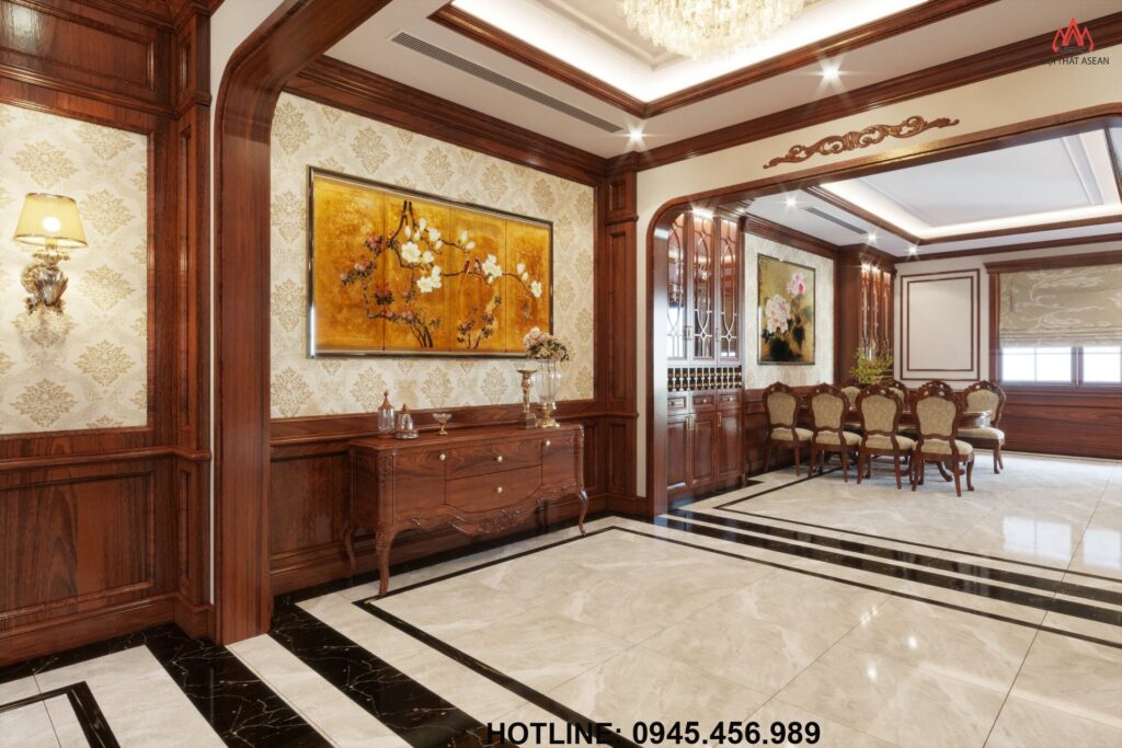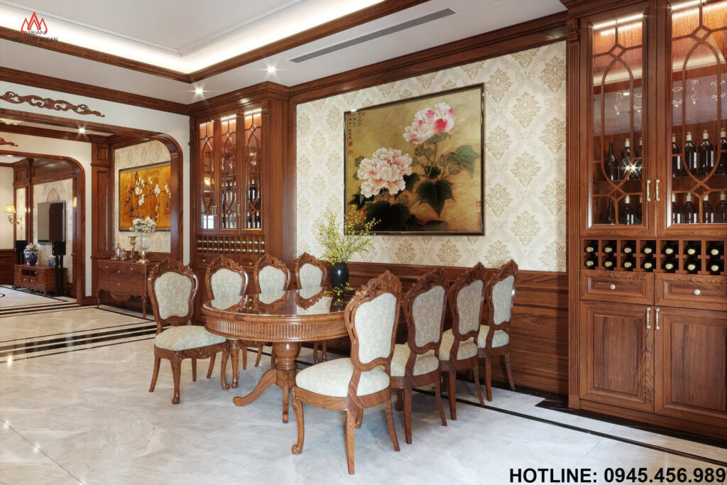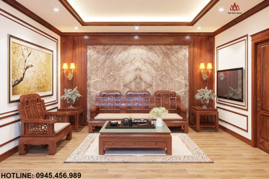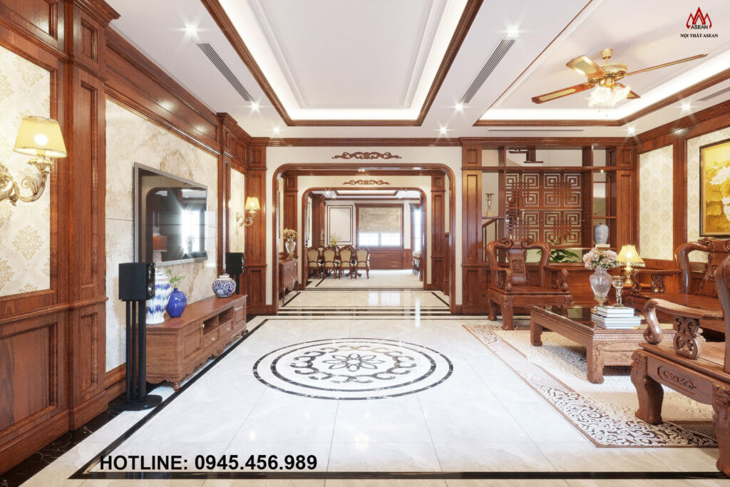 * Phong cách thiết kế Tân cổ thuần Việt, mang hơi ấm của gỗ, văn hoá nội thất Á Đông. Ngoài sự sang trọng, tinh hoa trong từng nét gỗ, nội thất còn mang lại giá trị phong thuỷ cao, gỗ tự nhiên là vật liệu dưỡng khí trong căn hộ. Gia chủ sử dụng gỗ tự nhiên gia đình sẽ luôn hạnh phúc, sức khoẻ dồi dào, làm ăn thịnh vượng.