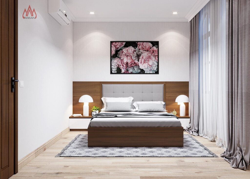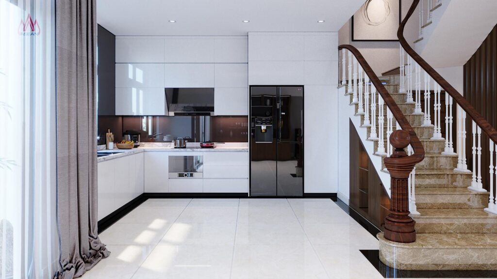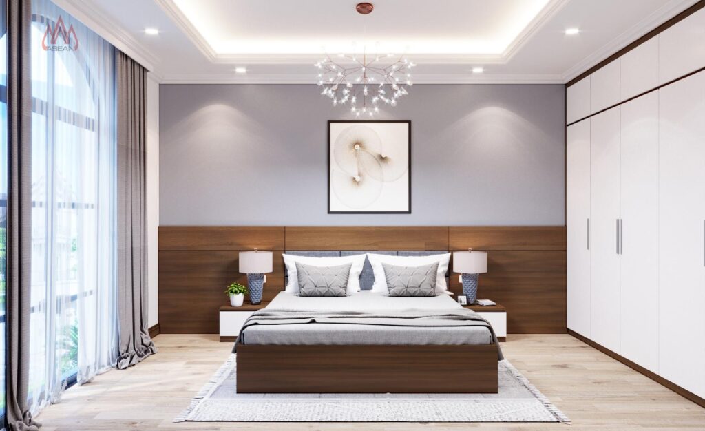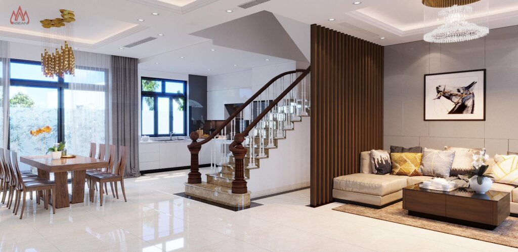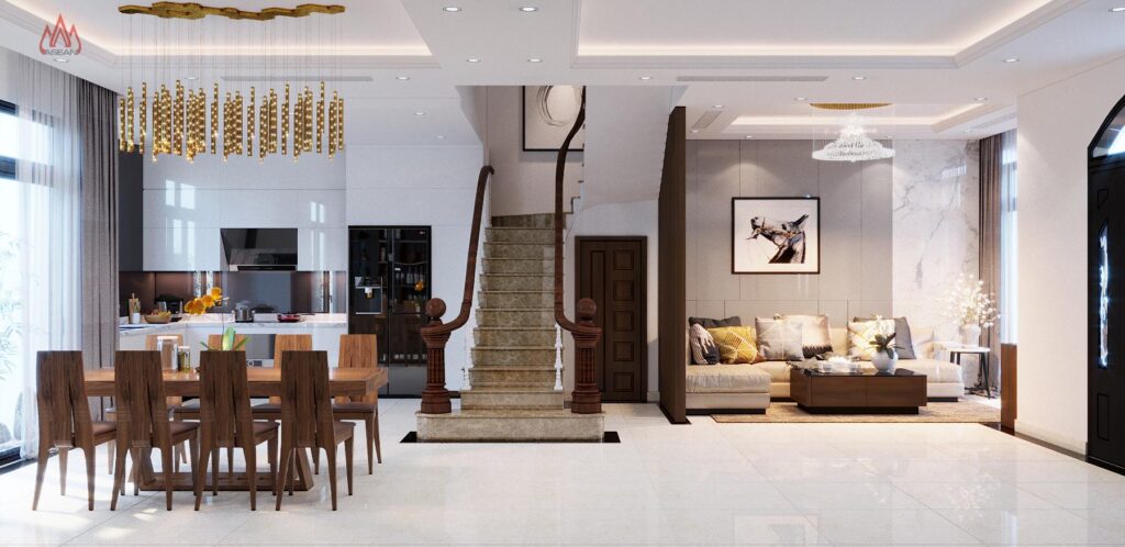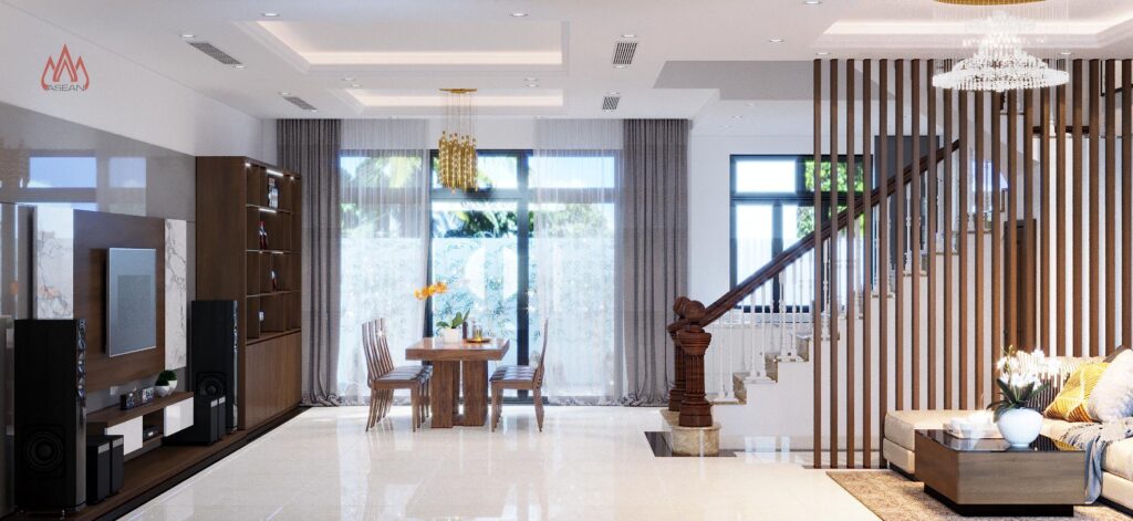 Được thiết kế theo phong cách hiện đại tạo nên không gian sang trọng và ấm cúng cho không gian của gia chủ. Thiết kế ưu tiên ánh sáng tự nhiên sự kết hợp gam màu gỗ với tông màu trắng tạo nên sự thoáng đãng nhẹ nhàng cho căn biệt thự của gia chủ.